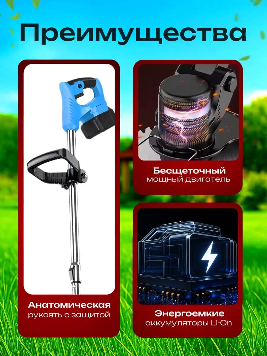 Отлично справляется с подрезкой травы и кустарников, работает тихо и удобно в использовании. Мощный и легкий в управлении - даже длительная работа не вызывает усталости. Батарея держит достаточно долго, чтобы обработать всю территорию, а зарядка занимает немного времени. Отличный инструмент для ухода за садом, который значительно облегчает работу и делает её более приятной.