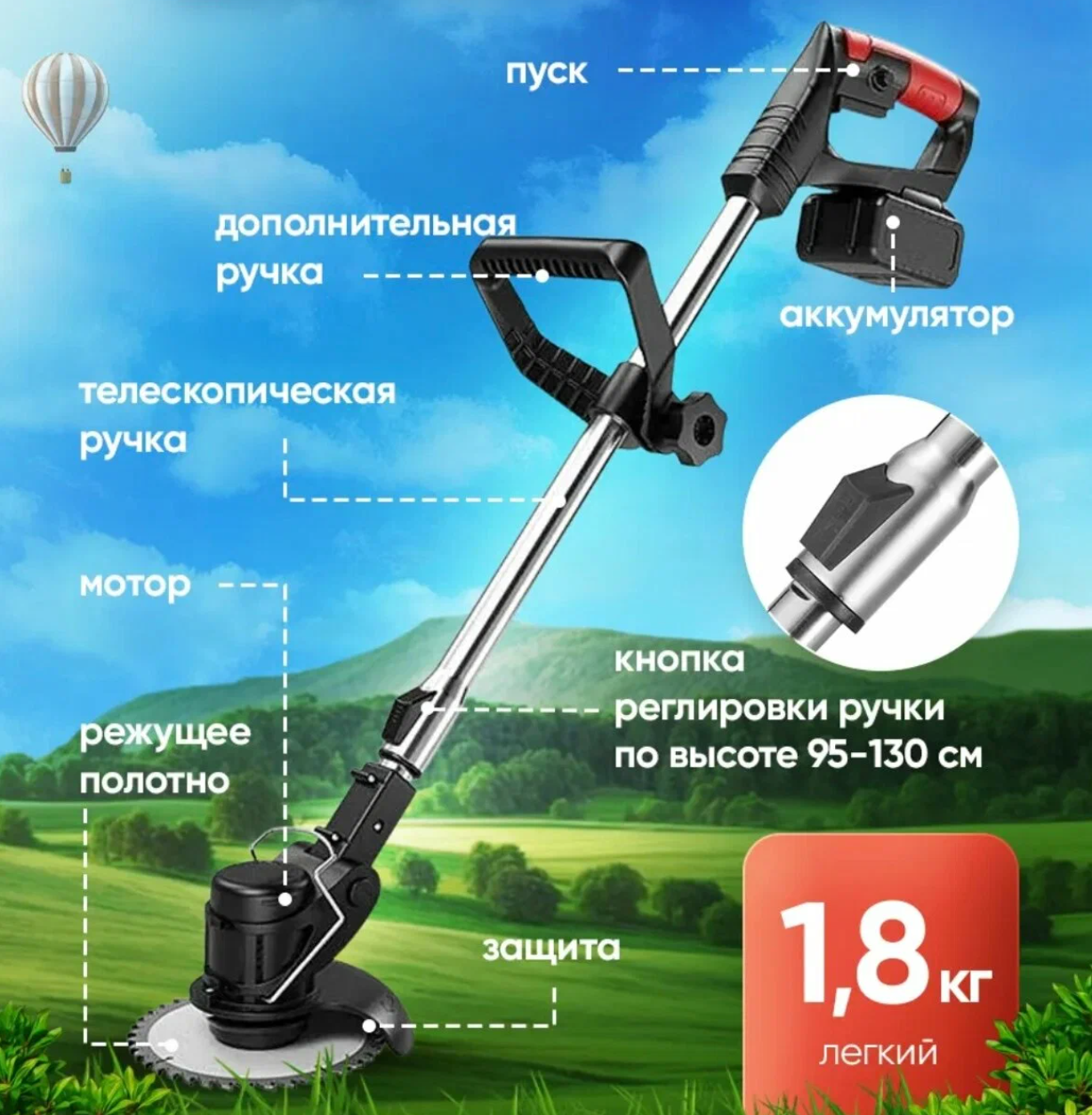Косит любые сорняки. Идеально ровный газон за несколько минут.